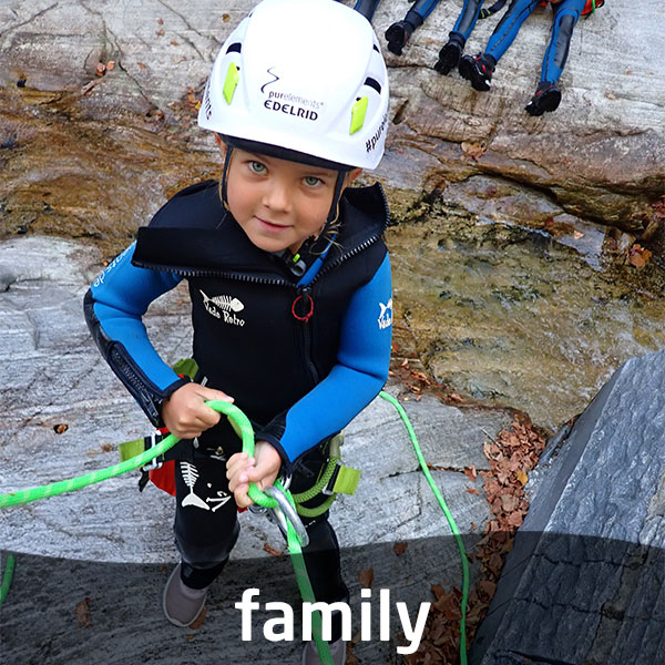 Für Familien bietet es sich an, eine Canyoning-Tour aus dem Angebot „Family“ zu buchen, da Ihr hier einzeln oder mit anderen Familien gemeinsam auf Abenteuertour im Tessin gehen könnt. Unsere Guides wissen gut mit Kindern umzugehen, verstehen sich darauf, die einführenden Sicherheitsanweisungen kindgerecht zu vermitteln und haben große Freude daran, zu sehen, wie schon die jüngsten Teilnehmer an der Herausforderung wachsen.